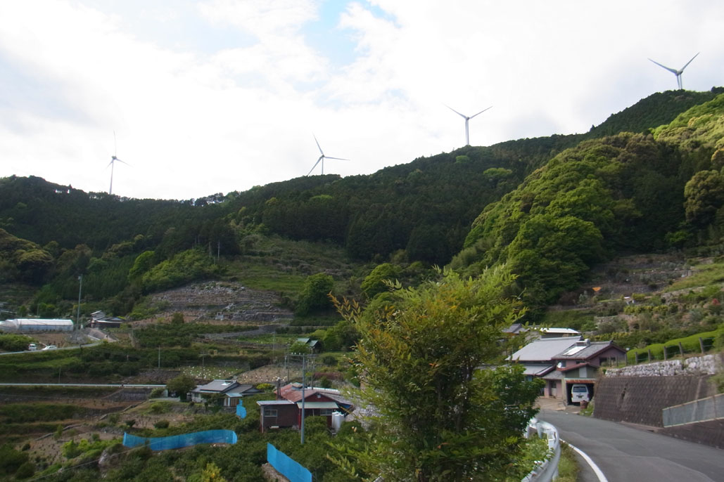 建物と道が下栗の里の雰囲気に近い中を進みます。山頂に並ぶ巨大風車がみるみる近づいて