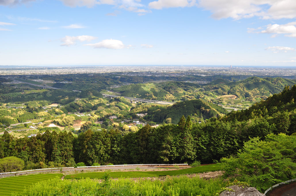 茶畑の中を通る新東名、浜松市街にその向こうの遠州灘が見渡せます。
