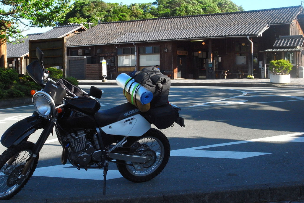 駅の前で1人のライダーが三脚で駅とバイクと自分のセルフ写真を撮っていた。
